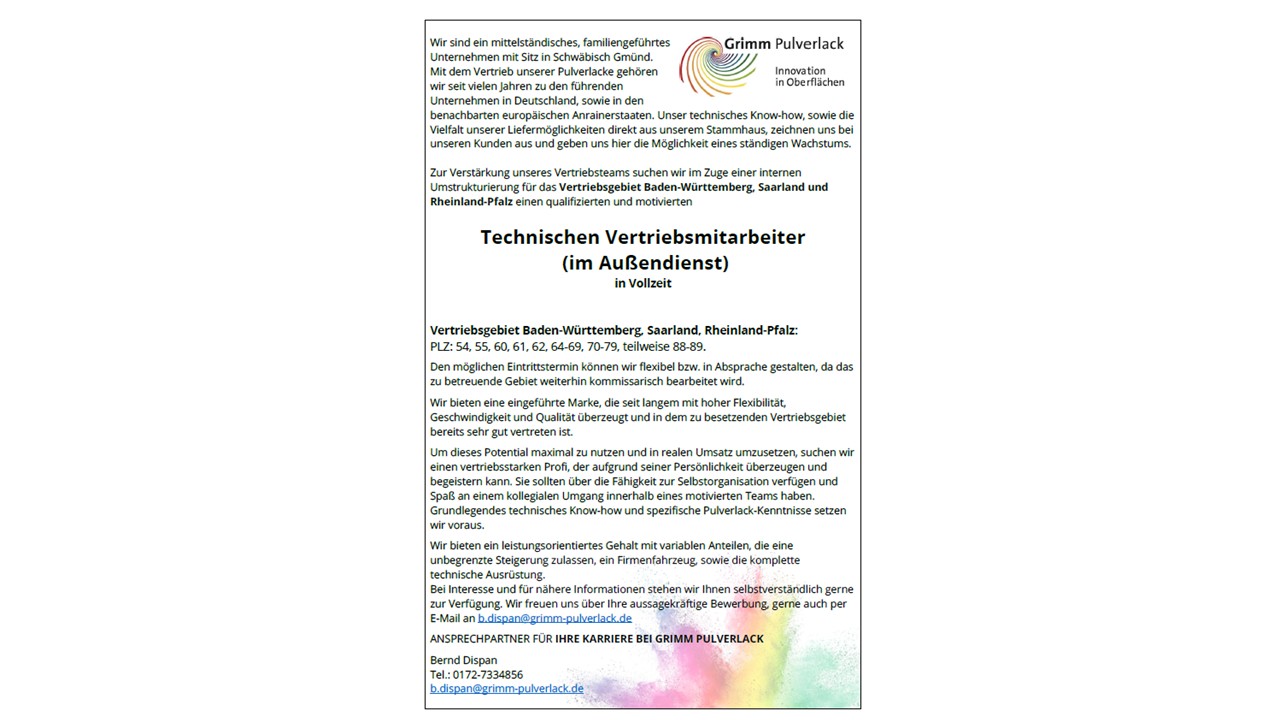 Technischer Vertriebsmitarbeiter im Außendienst für Baden-Württemberg, Saarland und Rheinland Pfalz: